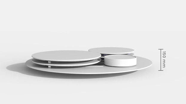 Ufo è una collezione di vassoi tondi per il buffet che permette spettacolari composizioni tridimensionali e dinamiche. Il modello più grande è girevole e poggia su gambe pieghevoli